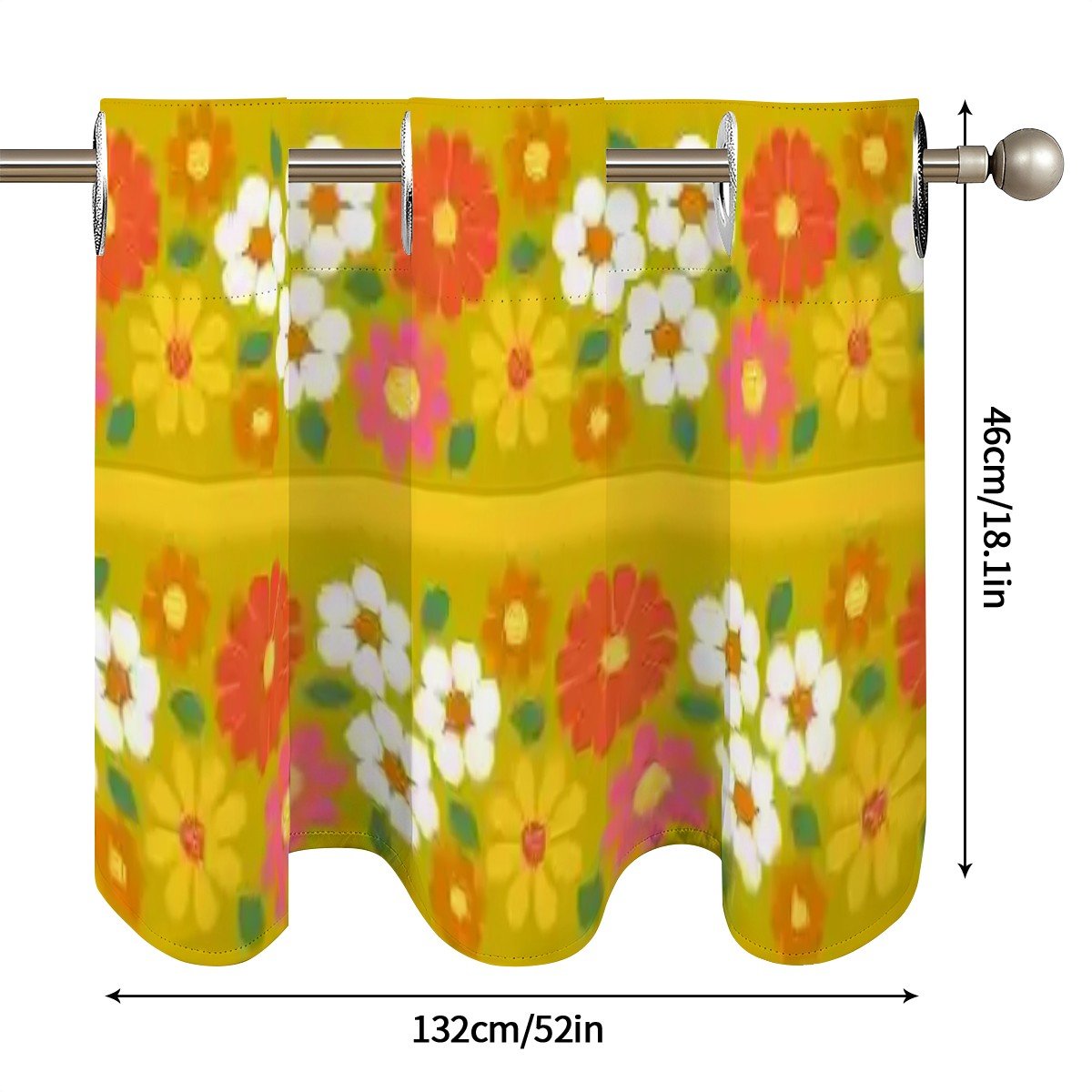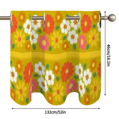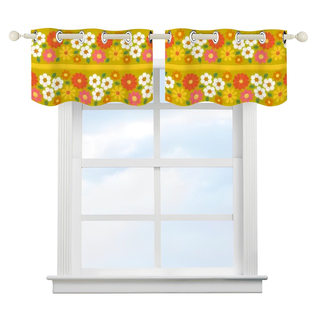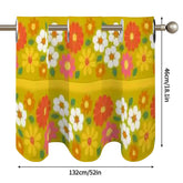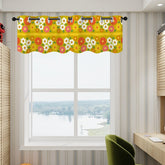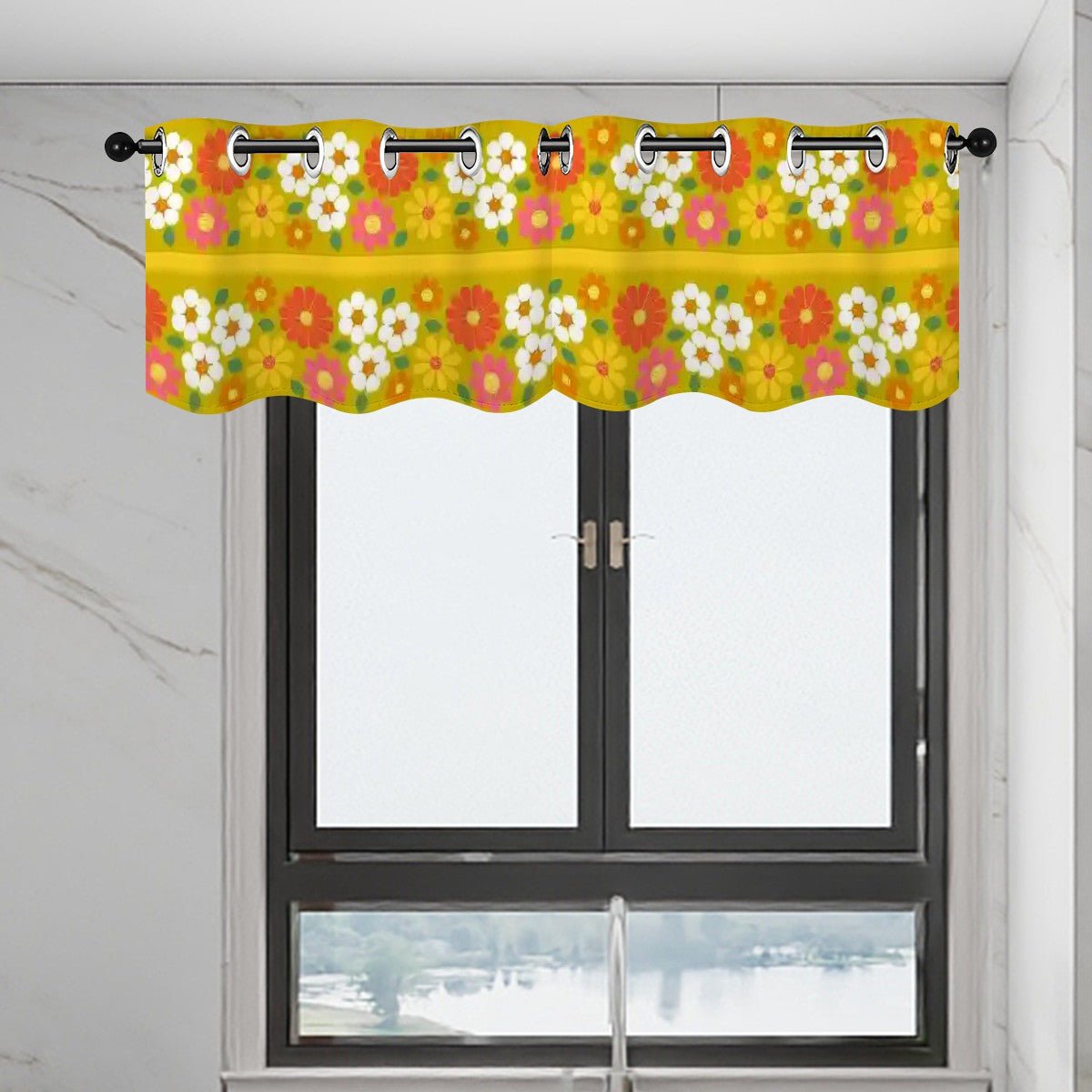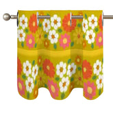 Add a vibrant retro touch to your space with this mid-century modern window valance, featuring bold daisy in orange, pink, yellow, and white on a mustard background. Perfect for kitchens, dining rooms, or anywhere that needs a pop of vintage floral charm. The grommet-style rings allow for easy hanging, making it a stylish and functional accent for MCM-inspired decor.