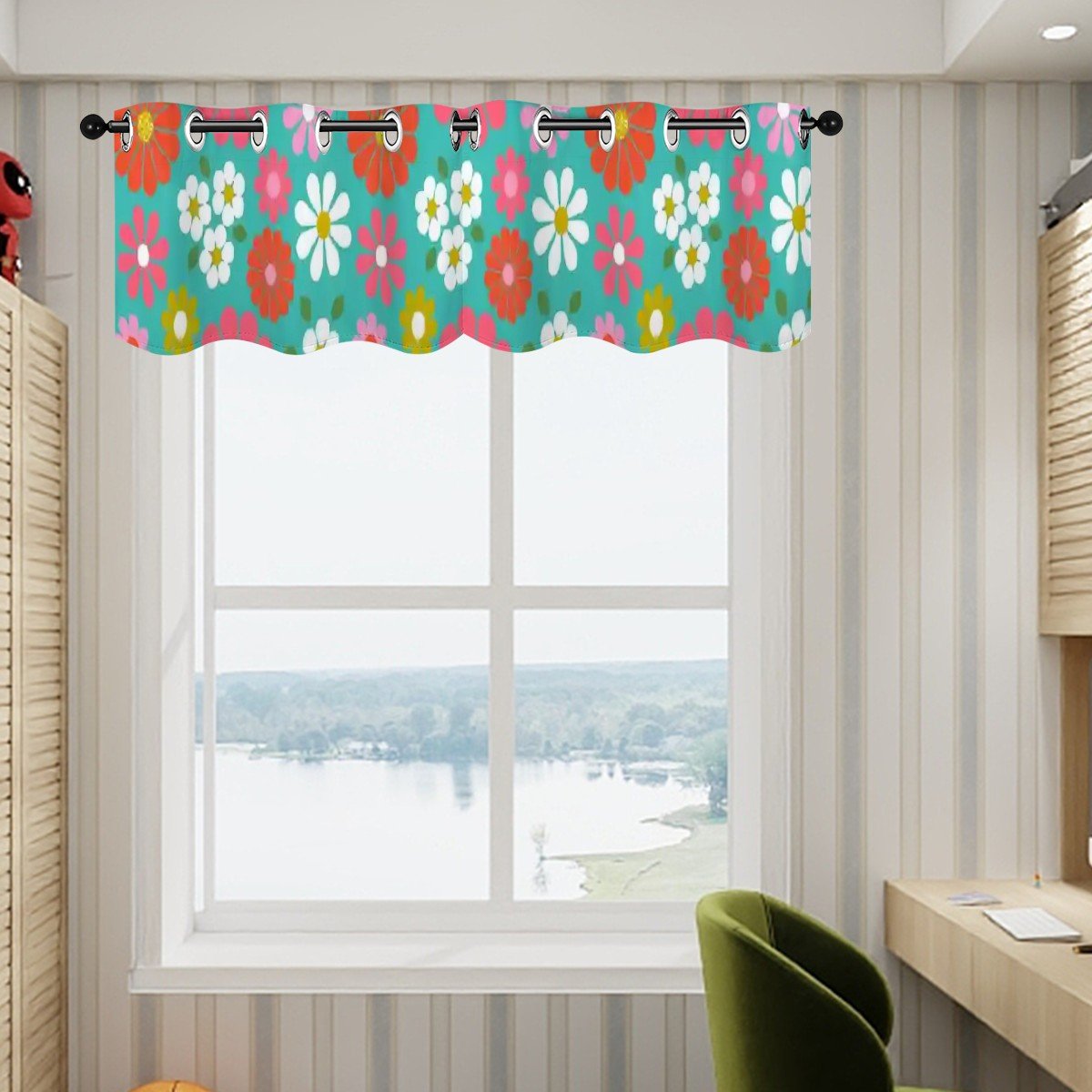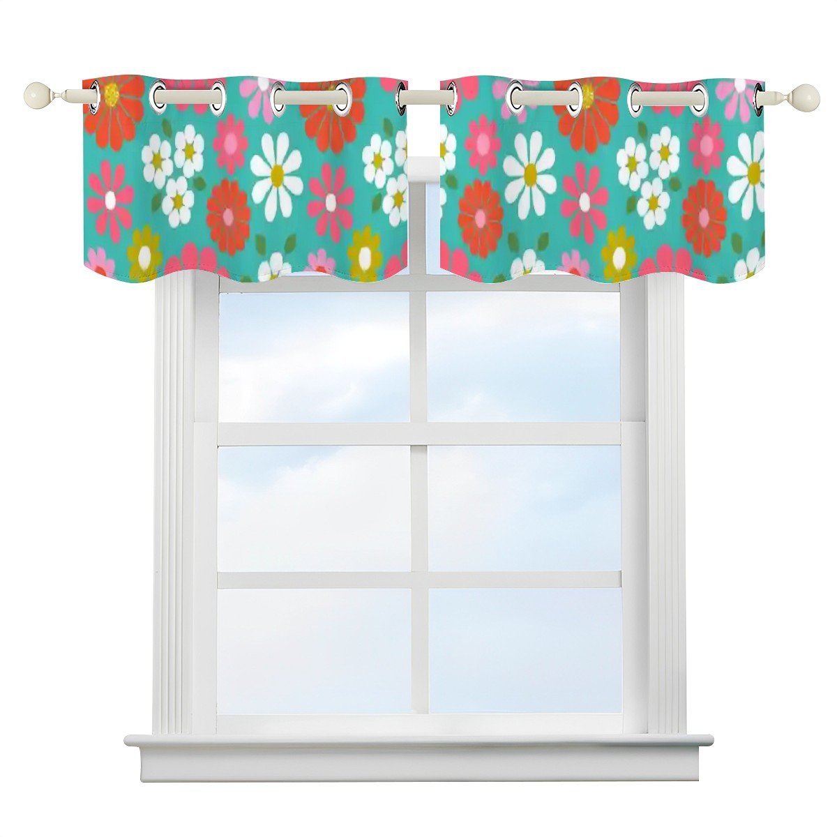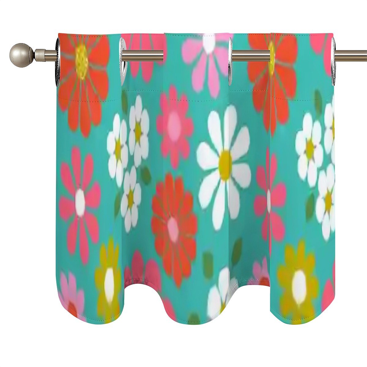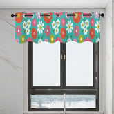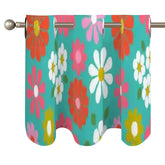 Add a pop of retro charm with this mid-century modern daisy floral window valance. A vibrant blend of 60s groovy blooms in pink, orange, yellow, and white against a teal backdrop, perfect for kitchens, bathrooms, or any space that needs a touch of vintage fun. Featuring grommet-style rings for easy hanging, this valance brings a playful mix of mod and MCM floral style to your home.