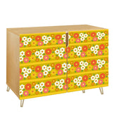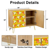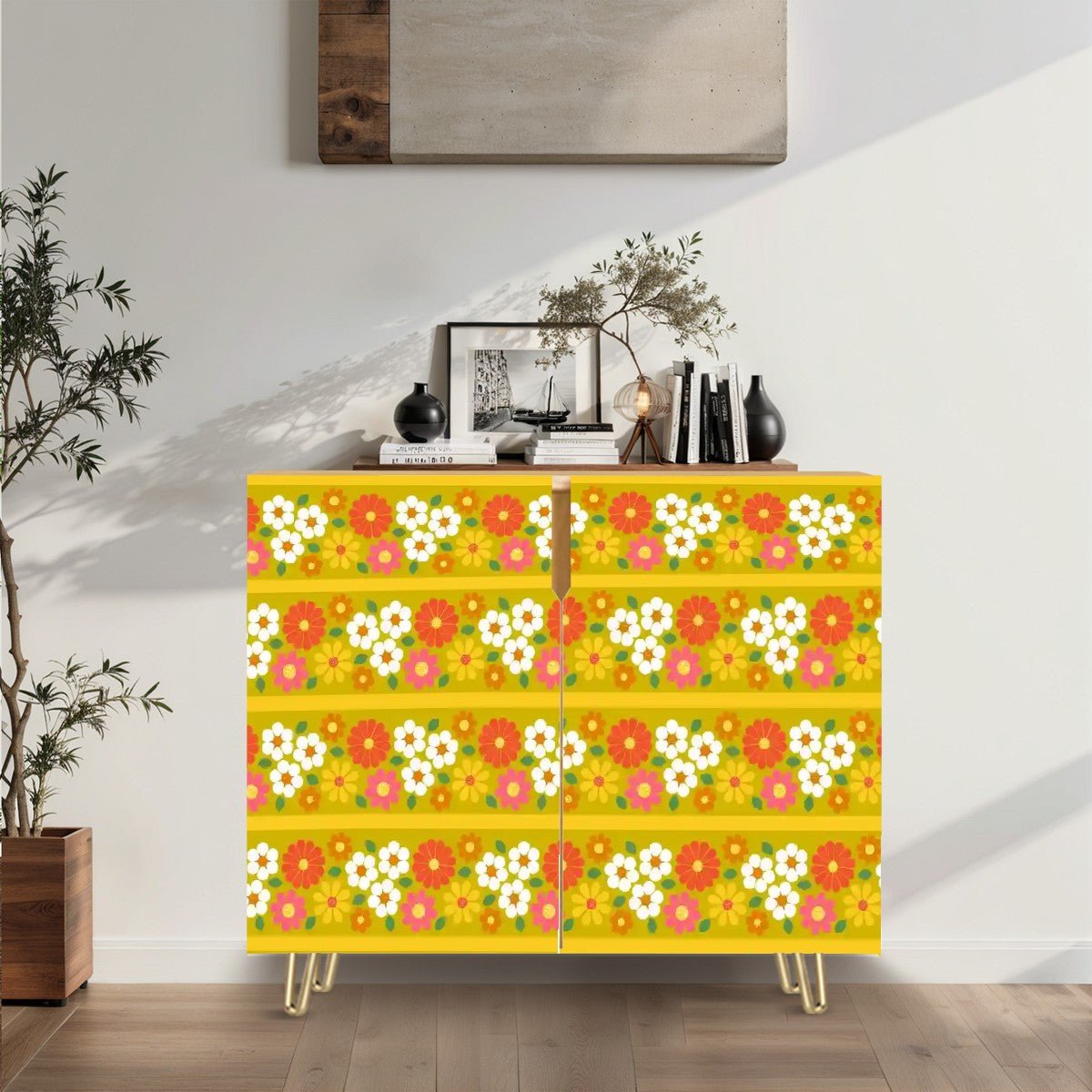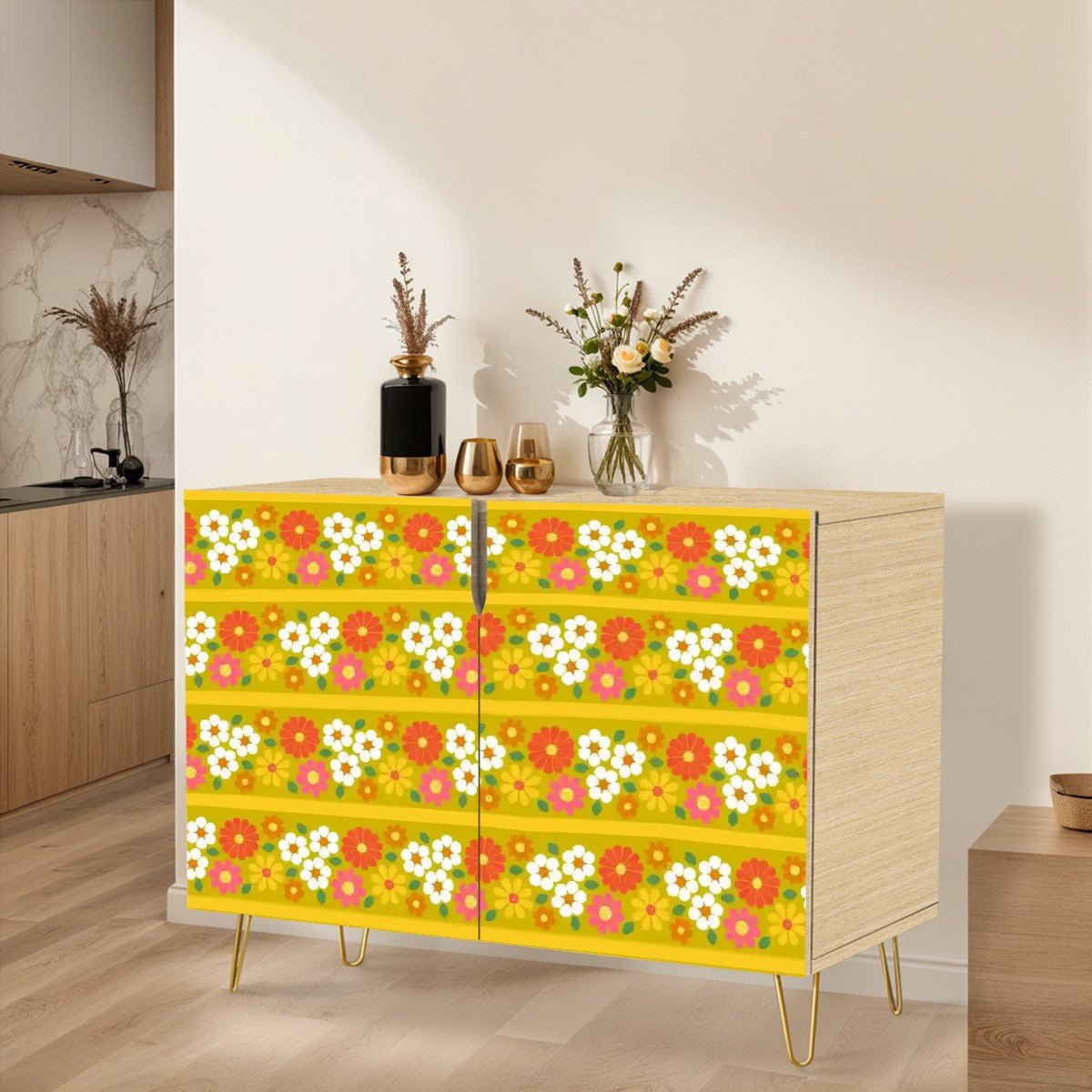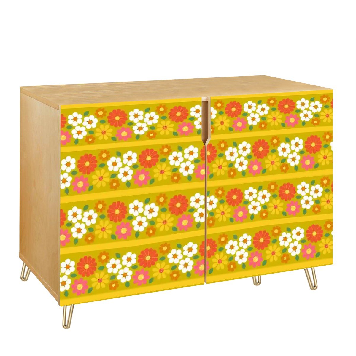 Get groovy with this retro 70s floral sideboard, bursting with flower power charm! Bold, warm tones of yellow, orange, and pink create a funky, feel-good vibe straight out of the 1970s. Featuring a sturdy wood frame with gold hairpin legs, this mid-century modern storage cabinet brings both vintage style and practical function. Whether in your dining space, living room, or entryway, it’s a statement piece that radiates kitschy nostalgia.
