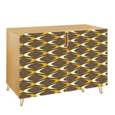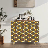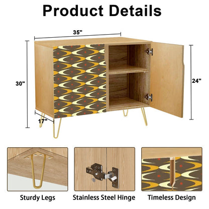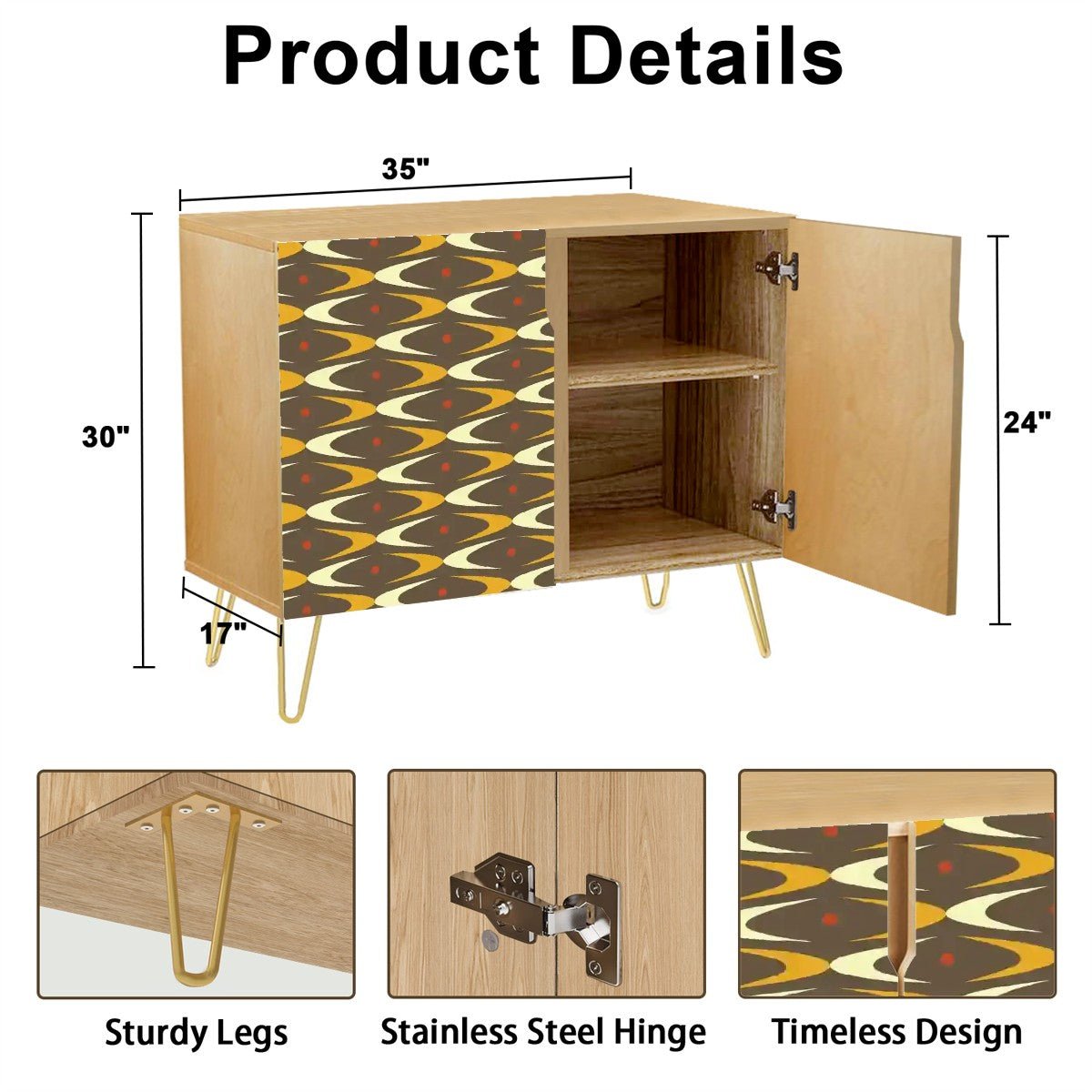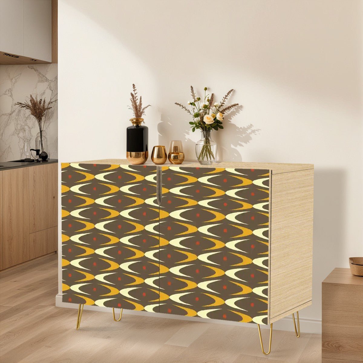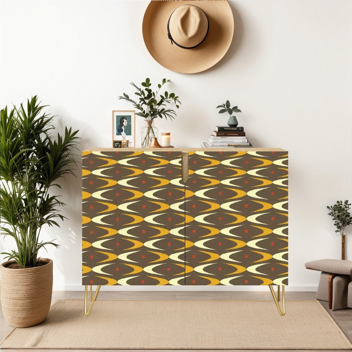 Bring bold 1950s flair to your space with this Mid Century Modern Boomerang Sideboard! Featuring a classic atomic boomerang pattern in warm, retro hues, this storage cabinet is a statement piece straight out of the atomic age. Sleek hairpin legs and timeless curves make it a perfect addition to your mid-century modern home. Whether you need extra storage or just want to add a touch of retro kitsch, this sideboard delivers serious vintage vibes.