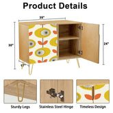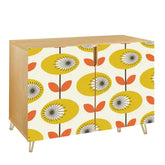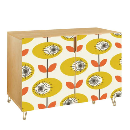 Add a touch of Danish Modern charm with this bold floral sideboard. Featuring a vibrant yellow and orange Scandinavian-inspired floral design, this mid-century storage cabinet is a retro dream. Sleek gold hairpin legs bring timeless elegance, making it a stylish statement piece for any room. Perfect for extra storage in living rooms, dining areas, or hallways.